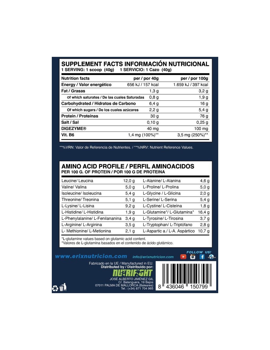 En la WHEY PLUS ULTIMATE de ERIX NUTRICIÓN los valores de la proteína que usamos son: