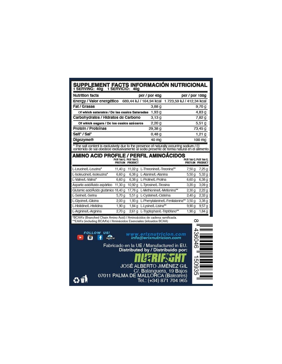 En la WHEY PLUS ULTIMATE de ERIX NUTRICIÓN los valores de la proteína que usamos son: