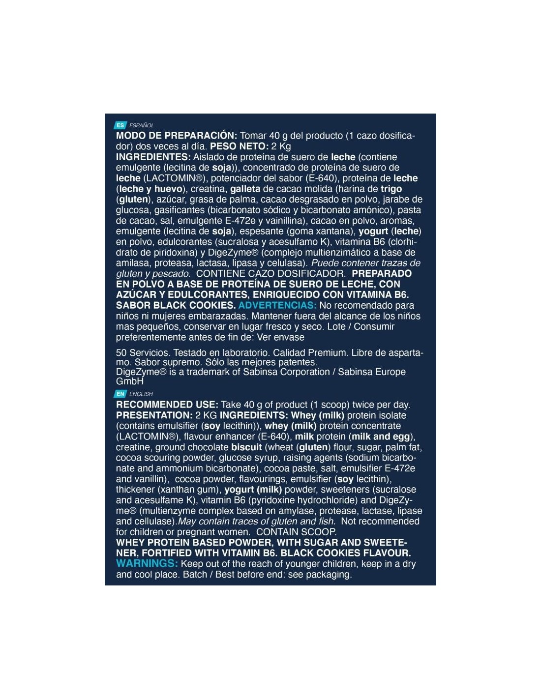 INGREDIENTES SABOR GALLETAS DE CHOCOLATE: Aislado de proteína de suero de leche (contiene emulgente (lecitina de soja)), concentrado de proteína de suero de leche (LACTOMIN®), potenciador del sabor (E-640), proteína de leche (leche y huevo), creatina, galleta de cacao molida (harina de trigo (gluten), azúcar, grasa de palma, cacao desgrasado en polvo, jarabe de glucosa, gasificantes (bicarbonato sódico y bicarbonato amónico), pasta de cacao, sal, emulgente E-472e y vainillina), cacao en polvo, aromas, emulgente (lecitina de soja), espesante (goma xantana), yogurt (leche) en polvo, edulcorantes (sucralosa y acesulfamo K), vitamina B6 (clorhidrato de piridoxina) y DigeZyme® (complejo multienzimático a base de amilasa, proteasa, lactasa, lipasa y celulasa). Puede contener trazas de gluten y pescado.