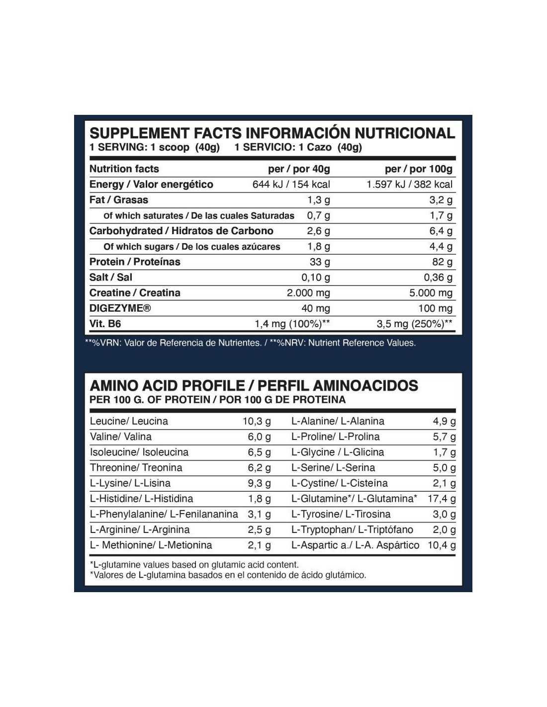 INGREDIENTES SABOR VAINILLA-AVELLANA: Aislado de proteína de suero de leche (contiene emulgente (lecitina de soja)), concentrado de proteína de suero de leche (LACTOMIN®), potenciador del sabor (E-640), proteína de leche (leche y huevo), creatina, aromas, emulgente (lecitina de soja), espesante (goma xantana), edulcorantes (sucralosa y acesulfamo K), vitamina B6 (clorhidrato de piridoxina) y DigeZyme® (complejo multienzimático a base de amilasa, proteasa, lactasa, lipasa y celulasa). Puede contener trazas de gluten y pescado.