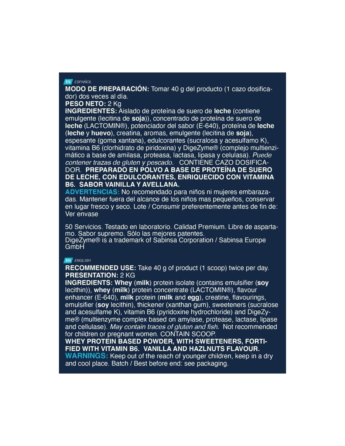 INGREDIENTES SABOR VAINILLA-AVELLANA: Aislado de proteína de suero de leche (contiene emulgente (lecitina de soja)), concentrado de proteína de suero de leche (LACTOMIN®), potenciador del sabor (E-640), proteína de leche (leche y huevo), creatina, aromas, emulgente (lecitina de soja), espesante (goma xantana), edulcorantes (sucralosa y acesulfamo K), vitamina B6 (clorhidrato de piridoxina) y DigeZyme® (complejo multienzimático a base de amilasa, proteasa, lactasa, lipasa y celulasa). Puede contener trazas de gluten y pescado.