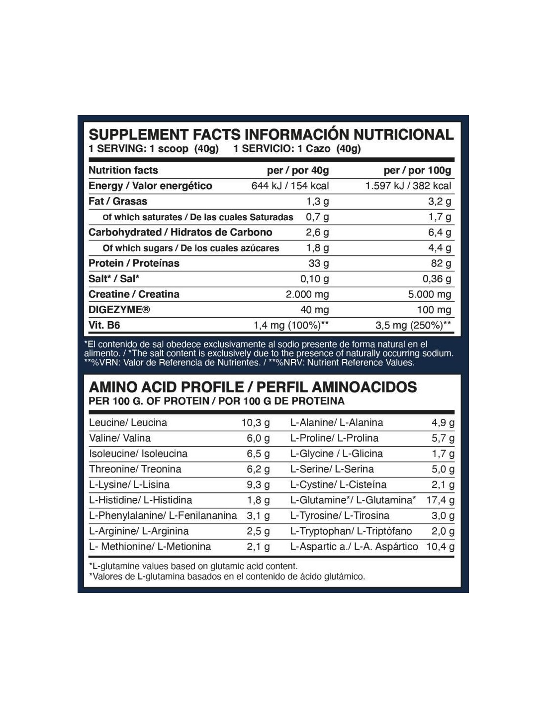 INGREDIENTES SABOR GALLETAS: Aislado de proteína de suero de leche (contiene emulgente (lecitina de soja)), concentrado de proteína de suero de leche (LACTOMIN®), potenciador del sabor (E-640), proteína de leche (leche y huevo), creatina, aroma, emulgente (lecitina de soja), espesante (goma xantana), yogurt (leche) en polvo, edulcorantes (sucralosa y acesulfamo K), vitamina B6 (clorhidrato de piridoxina) y DigeZyme® (complejo multienzimático a base de amilasa, proteasa, lactasa, lipasa y celulasa). Puede contener trazas de gluten y pescado.